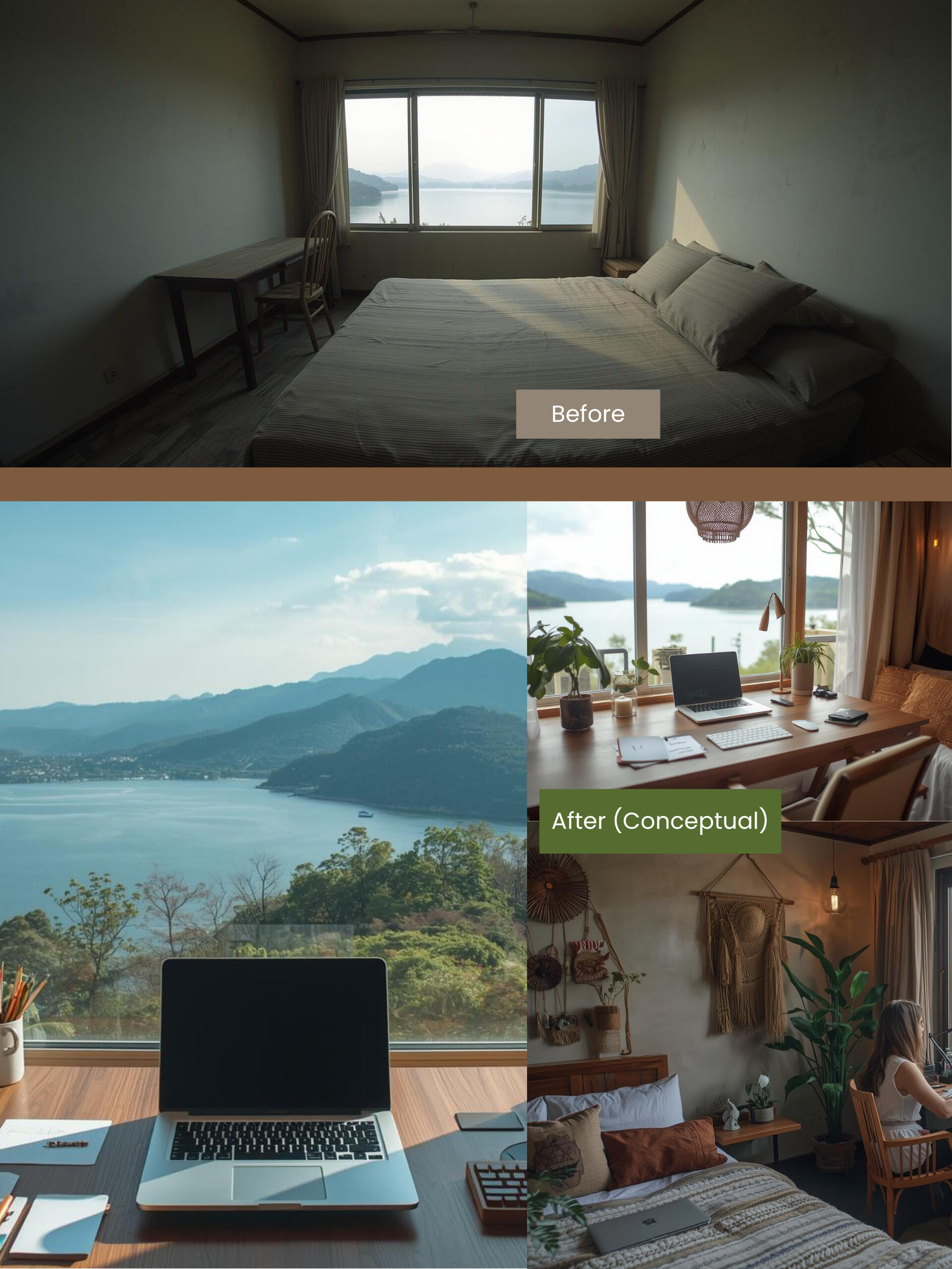 OTA Optimization | Design DirectionA small lakeside guesthouse with four rooms and stunning lake views in Lake Toba had strong potential but low perceived value due to outdated interiors and limited online storytelling.Through a light design refresh, clearer positioning for remote workers and slow travelers, and optimized OTA presence, the concept repositioned the stay as a cozy lakeside retreat with a “Work With a View” experience.Projected impact: